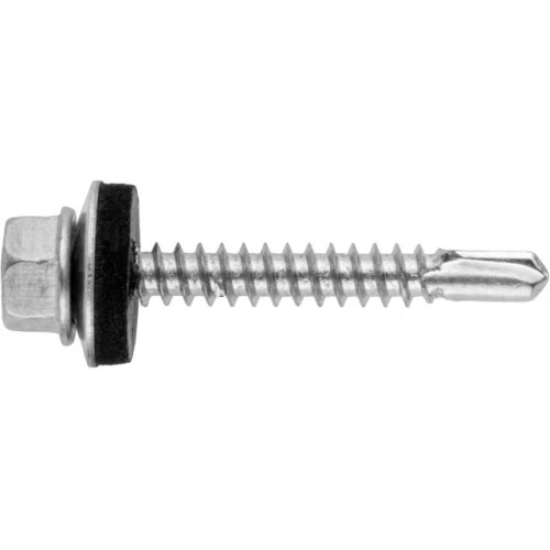 Оцинкованный кровельный саморез с шестигранной головкой, шайбой c резиновой EDPM прокладкой и сверловидным наконечником. Основание при креплении самореза - металл.