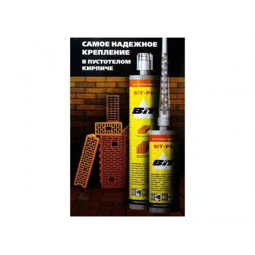 Химический анкер BIT-PE - высокоэффективный двухкомпонентный химический состав на основе синтетической быстроотверждаемой полиэстерной смолы в сочетании с металлическими анкерными элементами (резьбовыми шпильками, анкерными болтами, арматурными прутками и т.п.). Химические анкеры BIT-PE специально разработаны для осуществления анкерных креплений высокой надежности в стенах, выполненных из различных видов керамического кирпича (полнотелого, пустотелого), крупноформатных керамических камней и блоков с учетом физико-механических свойств, прочностных характеристик, коэффициентов температурного расширения и конструктивных особенностей данного класса строительных материалов. Единственно возможный способ осуществления надёжного крепления в пустотелых материалах в сравнении со всеми известными типами распорных дюбелей и анкеров. Несущая способность крепления зависит только от прочности материала основания.