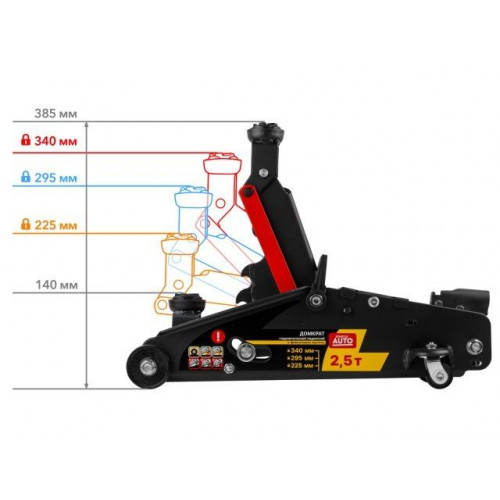Оснащение: резиновая опора (для защиты груза и самого домкрата от механических повреждений), предохранительный клапан (для защиты от перегрузки), фиксатор подъемного рычага на высоте 225, 295 и 340мм,