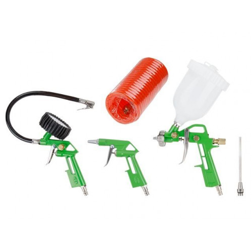 Базовый набор пневмоинструментов, состоящий из популярных компонентов, которые пригодятся начинающему пользователю воздушного компрессора. В набор входит краскораспылитель типа HVLP, пистолет для подкачки шин с манометром, продувочный пистолет для очистки поверхностей от пыли и сухой грязи, удлинительная насадка и спиральный пневматический шланг для подключения аксессуаров к компрессору.