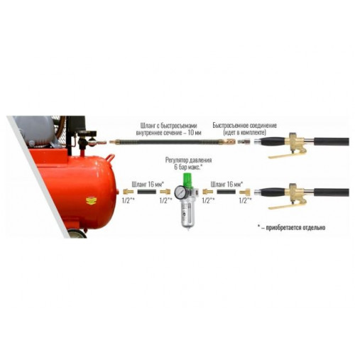 В комплекте имеется быстросъемный штуцер для удобства подключения к стандартным шлангам, но для достижения максимальной производительности рекомендуется использовать соединение елочка и шланг с внутренним сечением 16 мм.