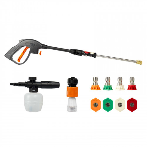 Мощное изделие для удаления любых загрязнений при помощи струи воды высокого давления, подходит для мойки автомобилей, мотоциклов, катеров, фургонов, аллей, плитки, деревянных изделий, кирпичной кладки, решеток гриль, садовой мебели, газонокосилок, очистки садовых деревьев и т.д. с температурой воды не более 40°С. Элегантный дизайн и удобная конструкция с держателями для аксессуаров делают работу с изделием приятной. Регулировка выходной струи входящими в комплект фрезами позволяет производить различные работы.