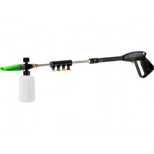 В комплект поставки входит пеногенератор, грязевая фреза для удаления стойких загрязнений, 4 веерных сопла под различные нужды, фильтр тонкой очистки.