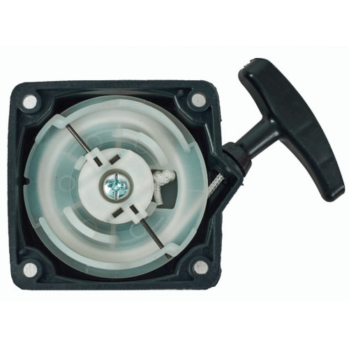 Стартер ручной для мотокосы с двумя зацепами (усами) представляет собой механизм, предназначенный для запуска двигателя мотокосы. Он состоит из корпуса, шнура, ручки и системы зацепов, которые взаимодействуют с маховиком двигателя. При вытягивании шнура зацепы входят в зацепление с маховиком, что позволяет провернуть коленчатый вал и запустить двигатель. Такой стартер обычно используется в бензиновых мотокосах и обеспечивает надежный запуск при правильной эксплуатации.