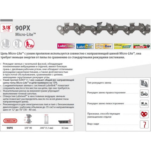 В пильной цепи 90PX используются режущие звенья с острыми фасками тип CHAMFER CHISEL.