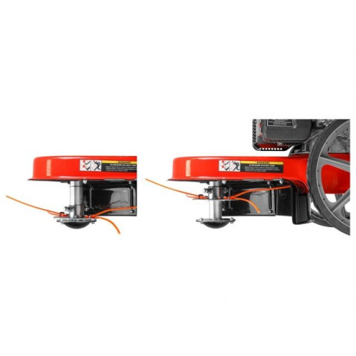 Не боится камней и неровностей (рабочий инструмент леска 4 мм): установлен горизонтально расположенный металлический диск, на внешний край которой крепится отрезок лески.