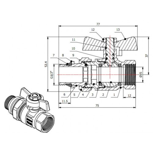 Кран шаровый 1/2" нар.-вн. бабочка (со сгоном) PN40, AV Engineering
