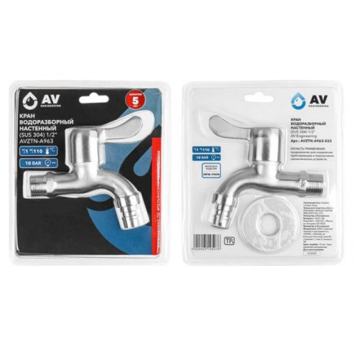 Кран водоразборный 1/2" нар. настенный (SUS 304), AV Engineering