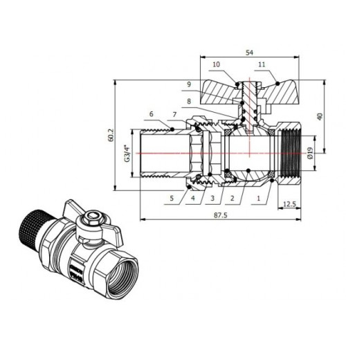 Кран шаровый 3/4" нар.-вн. бабочка (со сгоном) PN40, AV Engineering