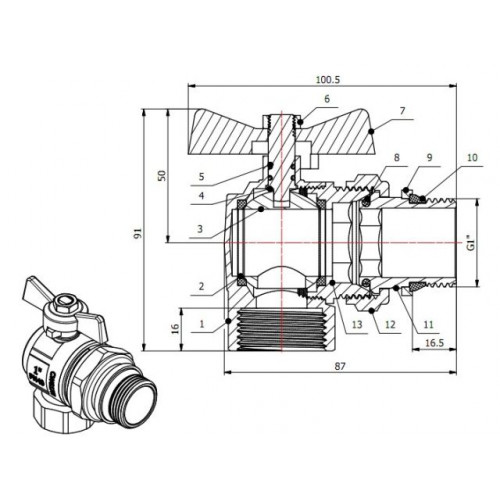 Кран шаровый угловой 1" нар.-вн. бабочка (со сгоном) PN40, AV Engineering