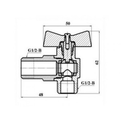 Кран угловой отличается от стандартного крана своей формой - он образует колено под прямым углом, ручка-бабочка располагается параллельно одной из сторон угольника. Кран имеет с одной стороны муфту с внутренней резьбой 1/2-B, а с другой стороны - цапку с наружной резьбой 1/2-B и комплектуется сгоном с резьбой 1/2-B и накидной гайкой.
