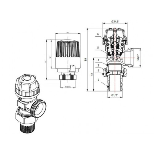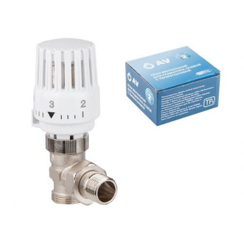 Кран вентильный под евроконус 1/2" нар. х 3/4" нар. для радиатора с термоголовой, AV Engineering