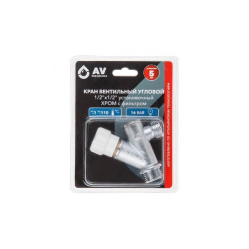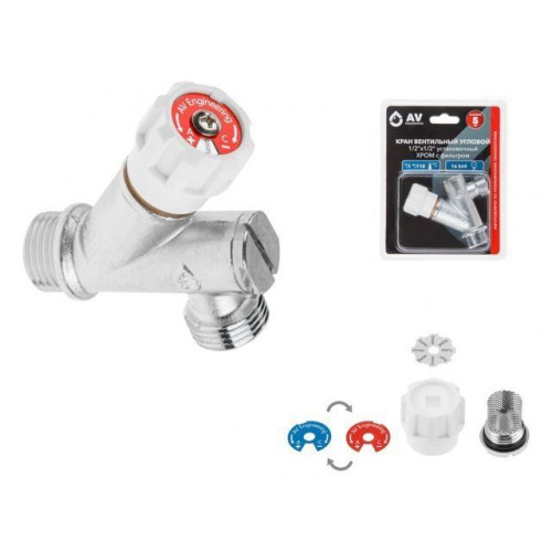 Кран вентильный угловой 1/2" нар. Х 3/4" нар. установочный ХРОМ для стир. машины с фильтром, AV Engi