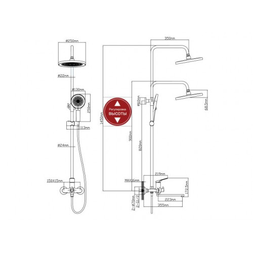 Душевая штанга, мм: регулиремая высота 1450, глубина 350