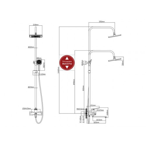 Душевая штанга, мм: регулиремая высота 1440, глубина 350