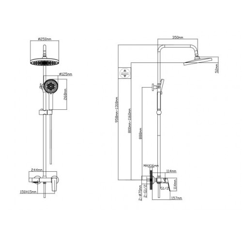 Душевая штанга, мм: регулиремая высота 958 - 1318,