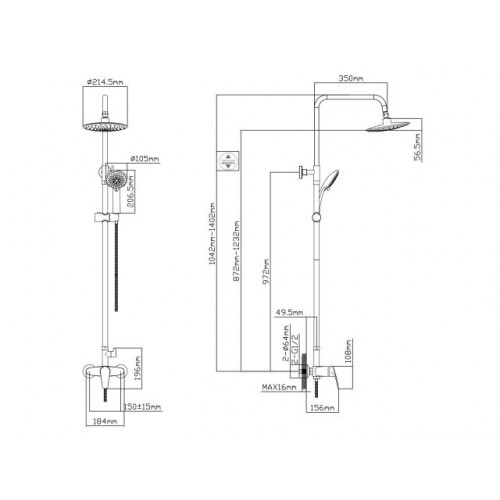 Душевая штанга, мм: регулиремая высота 1042 - 1402,