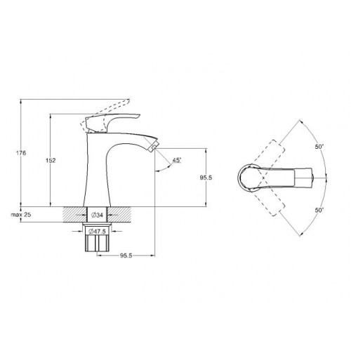 Угол поворота рукоятки вертик.: 25,