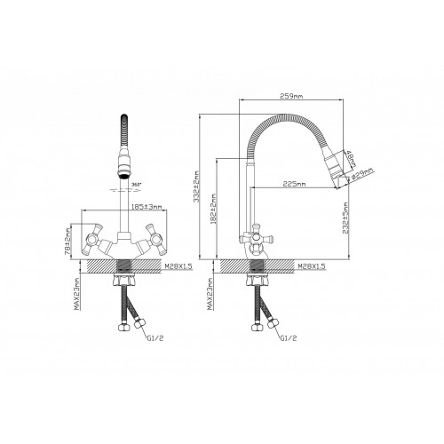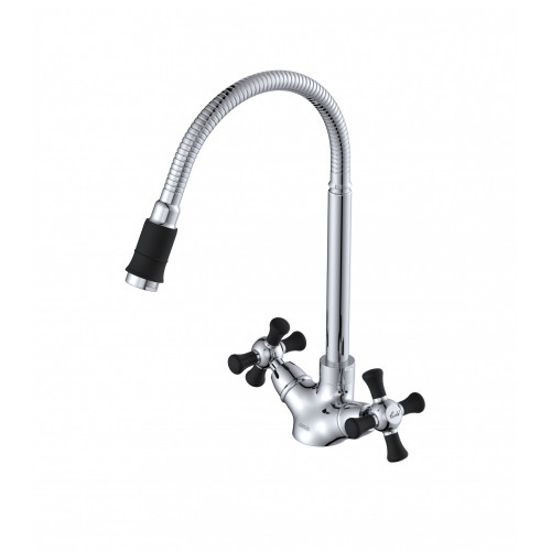 Двухвентильный смеситель для кухни с корпусом из латуни и гибким изливом черного цвета, крепление на гайке, присоединительный размер М28х1,5