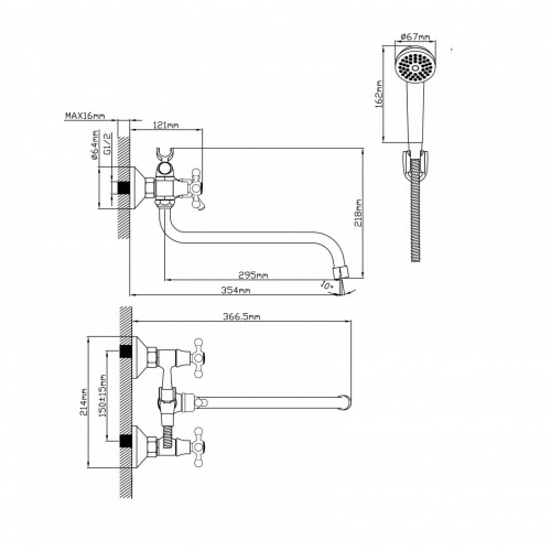 Технические характеристики Смеситель настенный латунный для ванной комнаты "Oasis" L2000HC_Vin (G1/2, 29,5см)