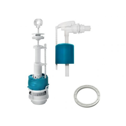 Комплект арматуры для бачка к унитазу. Сливной клапан СБа штоковый (для слива необходимо поднять ручку вверх и отпустить). Система "СТОП ПОТОК" (при нажатии на шток в любой момент смыва вода перестанет сливаться).