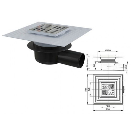 Сливной трап 105х105/50, подводка-боковая, решетка-нерж. сталь, гидрозатвор-сухой, Alcaplast