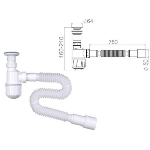 Сифон для биде, выпуск 64мм, с гибкой трубой 1 1/4"- 40/50мм, AV Engineering