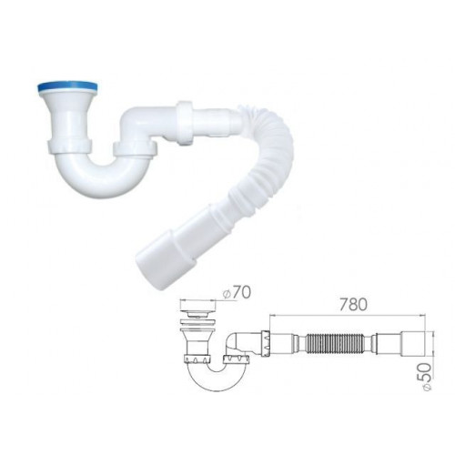 Сифон для душевого поддона U-образный h 130mm, выпуск 70 мм, с гибкой трубой 1 1/2" - 40/50мм, AV
