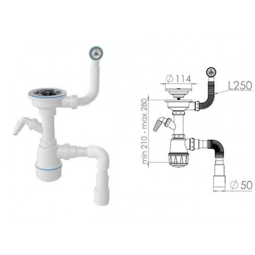 Сифон для кухни с круглым переливом, выпуск 3 1/2, пластиковый винт 45мм, с гибкой трубой 1 1/2"AV E