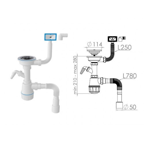Сифон для кухни с прямоугольным переливом , выпуск 3 1/2, с гибкой трубой 1 1/2" - 40/50мм, AV Engin