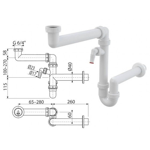 Сифон для мойки экономящий пространство cо штуцером и накидной гайкой 6/4, Alcaplast