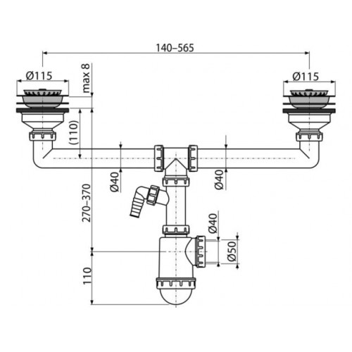 Сифон для сдвоенной мойки с нержавеющими решетками DN115 и штуцером, Alcaplast