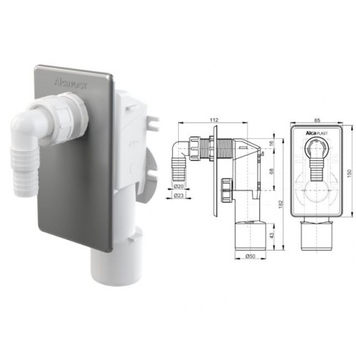 Сифон для стиральной машины под штукатурку хромированный, Alcaplast