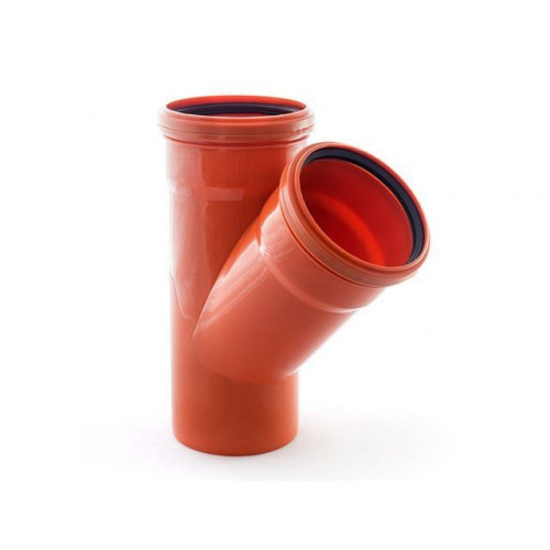 Тройник канализационный для трубы диаметром 110 мм. Имеет выход под трубу диаметром 110 мм под углом 45 градусов. Применяется при монтаже систем наружной канализации.