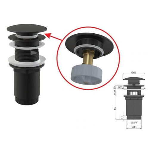 Водослив для умывальника click/clack 5/4, цельнометаллический с большой чёрной заглушкой, Alcaplast