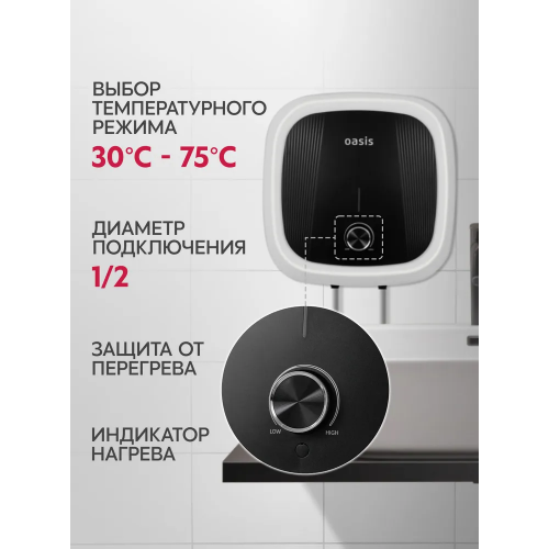 Электрический накопительный водонагреватель Oasis – это компактное устройство, которое можно установить на кухне или в ванной комнате. Небольшие габариты позволяют разместить его в шкафу под раковиной, не занимая много места. Эта модель отлично подойдёт для использования на дачах, в квартирах и любых других помещениях, где требуется локальный источник горячей воды.