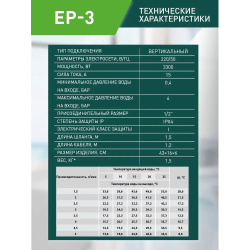 Технические характеристики Водонагреватель проточный Oasis EP-3 (3,3кВт, 1,2", 5л/мин, 6бар, душ+кран, дисплей, УЗО)