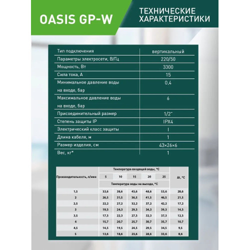 Технические характеристики Водонагреватель проточный Oasis GP-W (3,3кВт, 1,2", 6бар, гибкий излив, дисплей, УЗО)