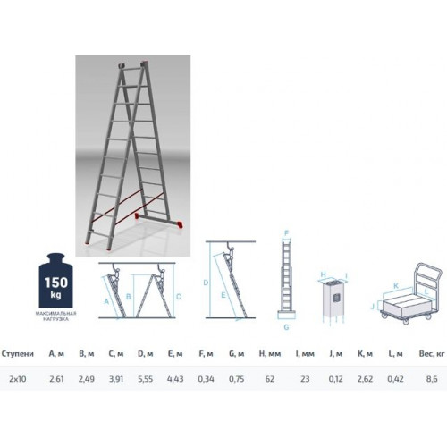 Лестница алюм. 2-х секц. 249/443см 2х10 ступ., 8,6кг PRO STARTUL (ST9946-10)