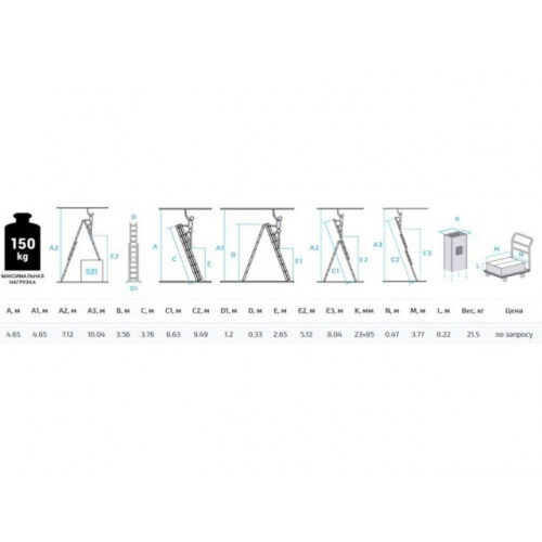 Высота лестницы - 949см, высота стремянки - 356см, высота секции - 376см.