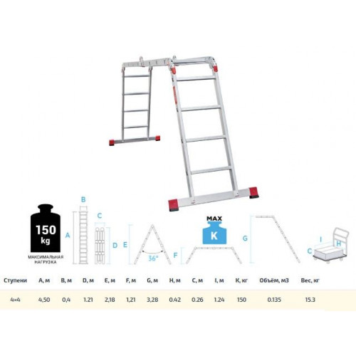 Лестница алюм. многофункц. трансформер 4х4 ступ., шир. 400 мм, 15,1кг NV3320 Новая высота