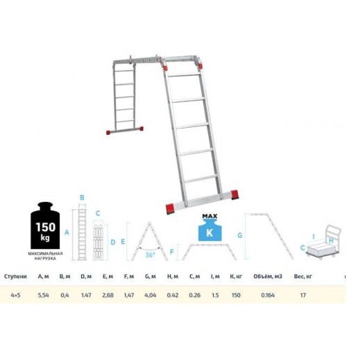 Лестница алюм. многофункц. трансформер 4х5 ступ., шир. 400 мм, 16,8кг NV3320 Новая высота