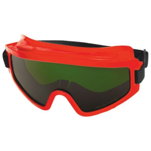 Очки с непрямой вентиляцией с панорамным защитным стеклом-светофильтром тёмно-зелёного цвета из ацетата целлюлозы (СА) с незапотевающим покрытием, устойчивым к царапанию и истиранию, обладающим самополирующимся эффектом, антистатичностью.
