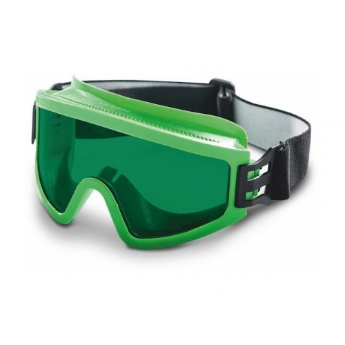 Очки с прямой вентиляцией с панорамным защитным стеклом-светофильтром зелёного цвета из поликарбоната (РС Strong Glass) с влагостойким, двусторонним суперпрочным, твердым и одновременно незапотевающим покрытием (без потери свойств от времени).