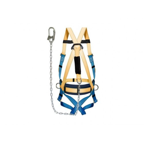 Состоит из привязи ремня с пряжкой, наплечных и набедренных лямок, кушака, двух D-колец на поясе (для удержания и позиционирования) и одного на спине и страховочного стропа из металлической цепи с амортизатором. Привязь упакована в водонепроницаемый пакет и содержит паспорт и инструкцию по применению.