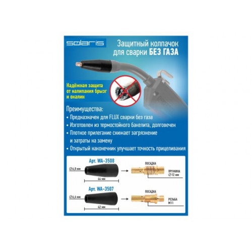 Колпачок изготовлен из термостойкого бакелита. Рассчитан для высоких температур и более длительного срока службы. Предназначен только для FLUX сварки без использования защитного газа. Крепление осуществляется за счёт резьбового соединния,