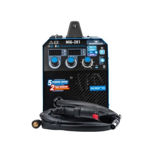 Аппарат оснащен встроенной горелкой MIG 2 метра и возможностью смены полярности для сварки проволокой без газа (FLUX).