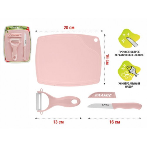 В наборе: нож кухонный, общая длина 16 см, нож для чистки 13 см, защитный чехол для ножа, доска разделочная 16х20 см