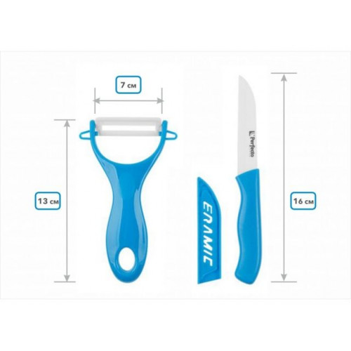 В наборе: нож кухонный, общая длина 16 см, длина лезвия 7 см, нож для чистки 13 см, защиный чехол для ножа.