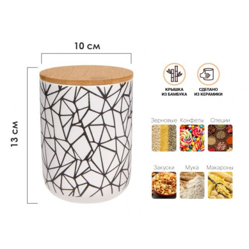 Банка керамическая для сыпучих продуктов с бамбуковой крышкой. В банке прекрасно хранятся специи, бобовые, макаронные изделия. Разные крупы удобно пересыпать из пакетов удобную и стильную банку.